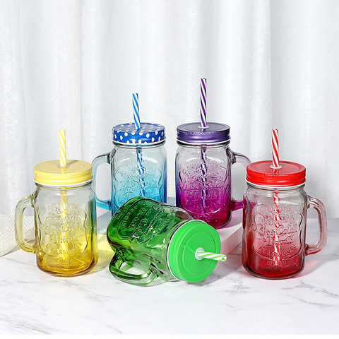Venta al por mayor Mason Tarros para beber con tapa y mango cuadrado Mason Taza de vidrio para beber con orificio para el mango
