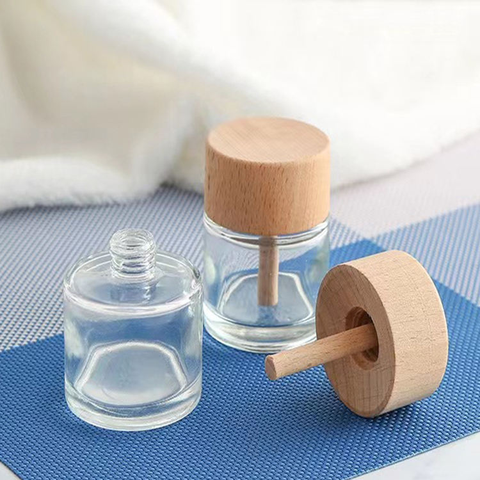 थोक स्पष्ट राउंड रीड ग्लास बोतल सुगंध डिफ्यूज़र बोतल के साथ स्क्रू लकड़ी के ढक्कन के साथ